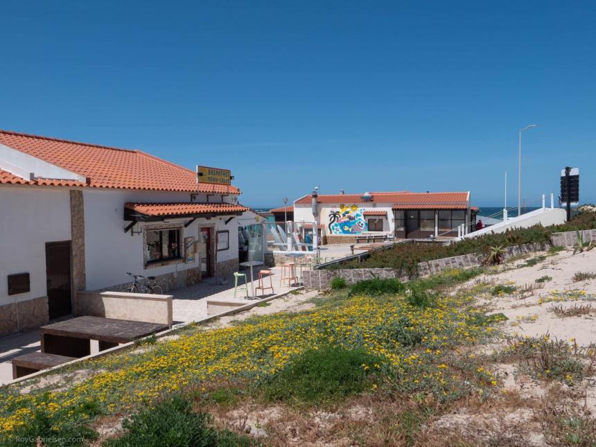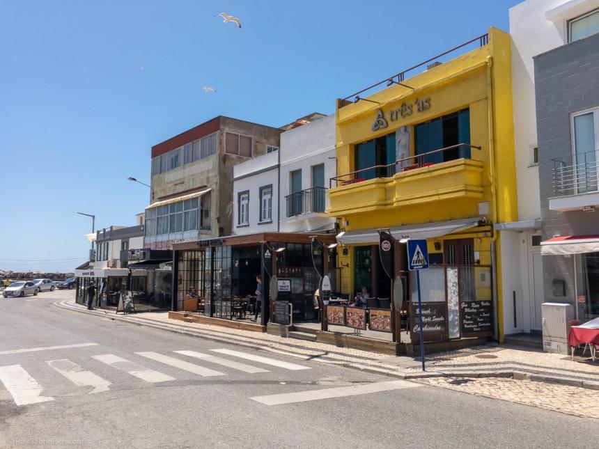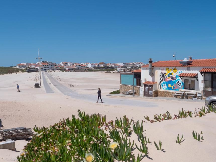 Det er fortsatt en liten landsby med smale gater og hvitkalkede hus, men stemningen er tydelig mer surf & backpackerenn i Peniche sentrum.