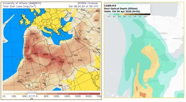 Samtidig viser støvprognoser fra Copernicus Atmosphere Monitoring Service, som også brukes av regionale støvsentre i Sør-Europa, at det er ventet transport av saharastøv inn over Den iberiske halvøy. Safe Communities Portugal har også omtalt mandag 6. april som dagen da støvkonsentrasjonen kan bli størst, før forholdene endrer seg videre inn mot tirsdag.
